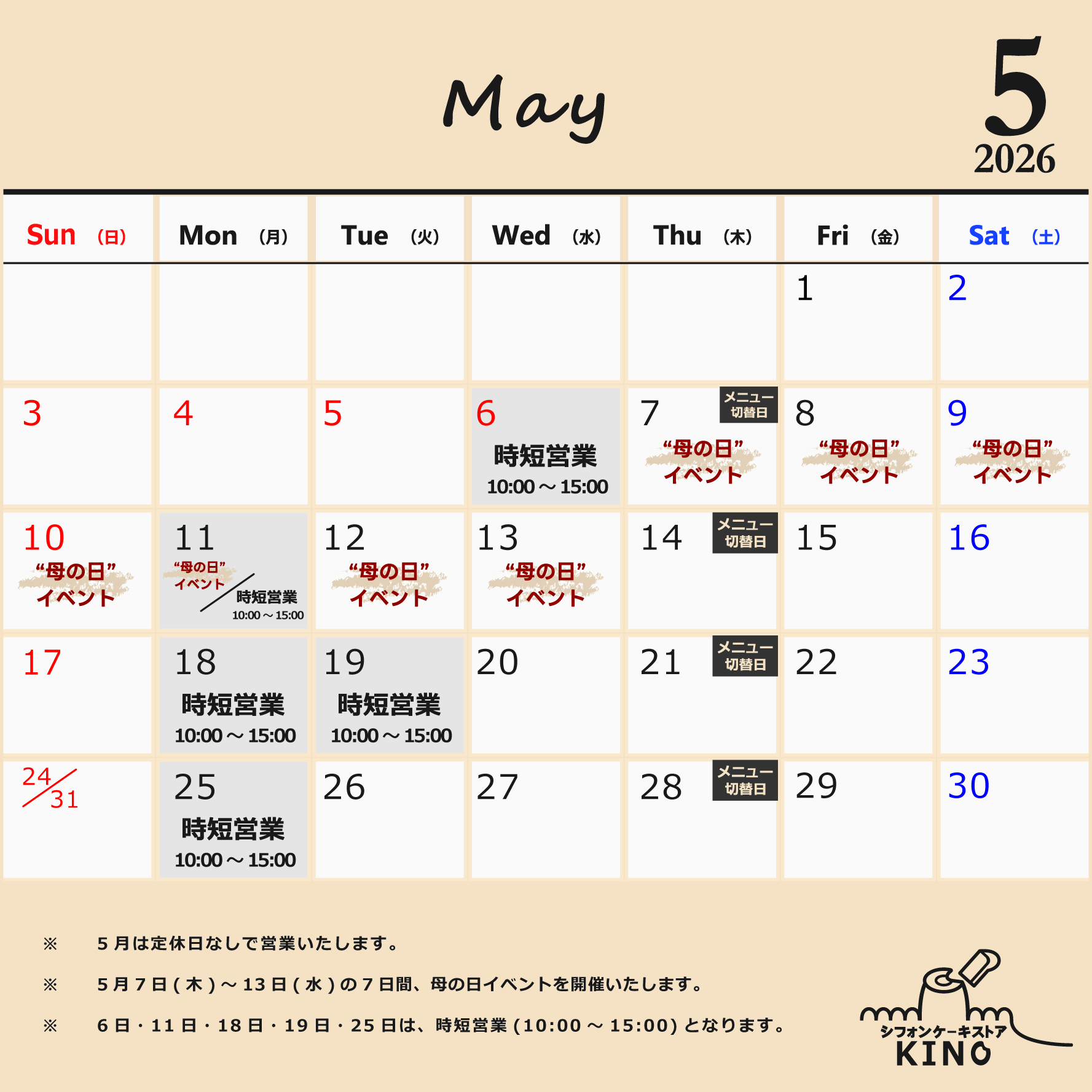 2026年5月の営業日をお知らせいたします。